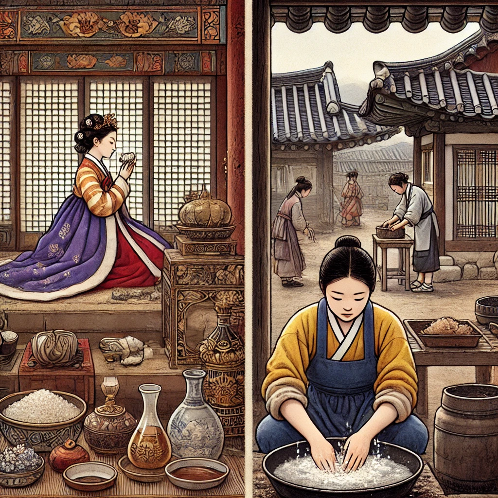 조선시대에는 손 씻기와 관련된 위생 관념이 계층에 따라 다르게 나타났다. 궁중에서는 쌀뜨물과 향신료를 사용하여 손을 씻었고, 서민층에서는 숯가루와 된장과 같은 자연적 재료를 활용했다. 이는 계층에 따른 생활 방식과 자원 활용 방식의 차이를 보여준다.